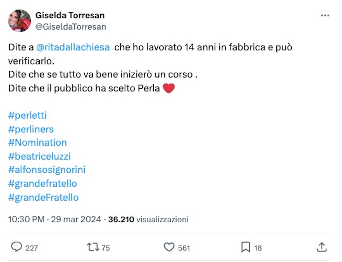 La discussione ha guadagnato ulteriori contorni quando Giselda Torresan, un’altra ex concorrente nota per le sue frizioni con Beatrice Luzzi, ha replicato su X, difendendo il suo percorso e sottolineando il sostegno del pubblico a Perla Vatiero. La reazione del web, tuttavia, non si è fatta attendere, sommergendo il post di Torresan di critiche e commenti sarcastici.