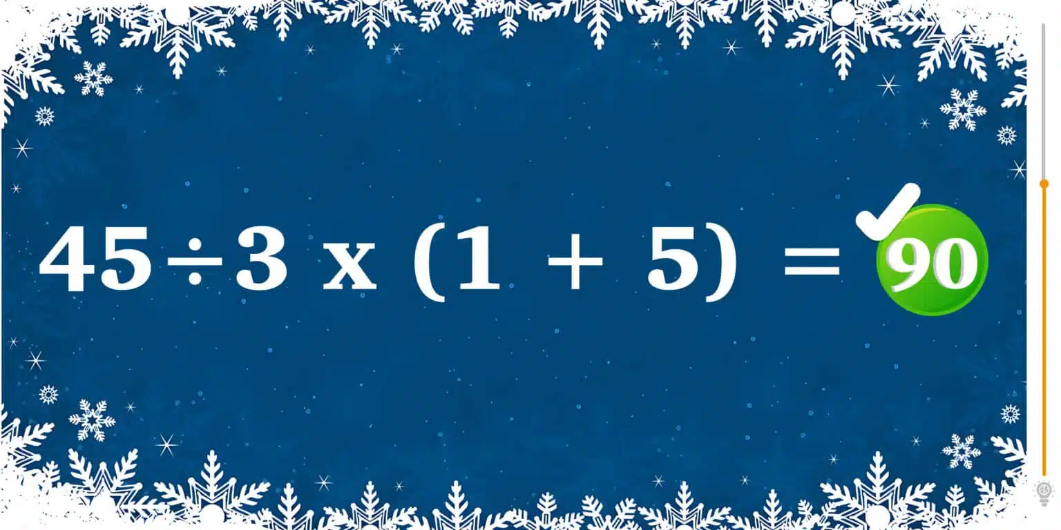 In questo puzzle, abbiamo delle parentesi. Quindi, iniziamo risolvendo l’operazione tra parentesi: (1 + 5) = 6. Ora abbiamo un’equazione modificata: 45 ÷ 3 x 6 = ?