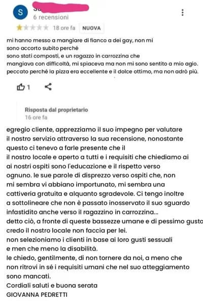 Il cliente ha scritto: “La pizza era eccellente e il dolce ottimo, ma non andrò più”. Fino a qui, sembrerebbe una recensione normale. Ma poi ha continuato: “Mi hanno messo a mangiare di fianco a dei gay… E un ragazzo in carrozzina che mangiava con difficoltà”. Queste poche righe hanno immediatamente attirato l’attenzione online.