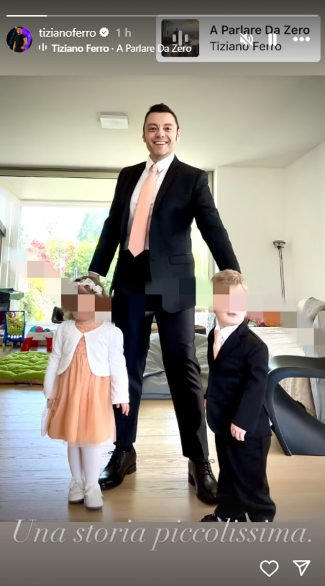 L’immagine è carica di tenerezza, mostrando un weekend incentrato sull’amore. Papà e figli sono vestiti in coordinato: Tiziano indossa un abito scuro e una cravatta color pesca, proprio come il suo figlioletto, che sfoggia lo stesso stile in versione mignon. La figlia, invece, è adorabile in un vestitino pesca. La canzone, “A parlare da zero”, ha un testo toccante che rispecchia l’amore paterno di Tiziano.