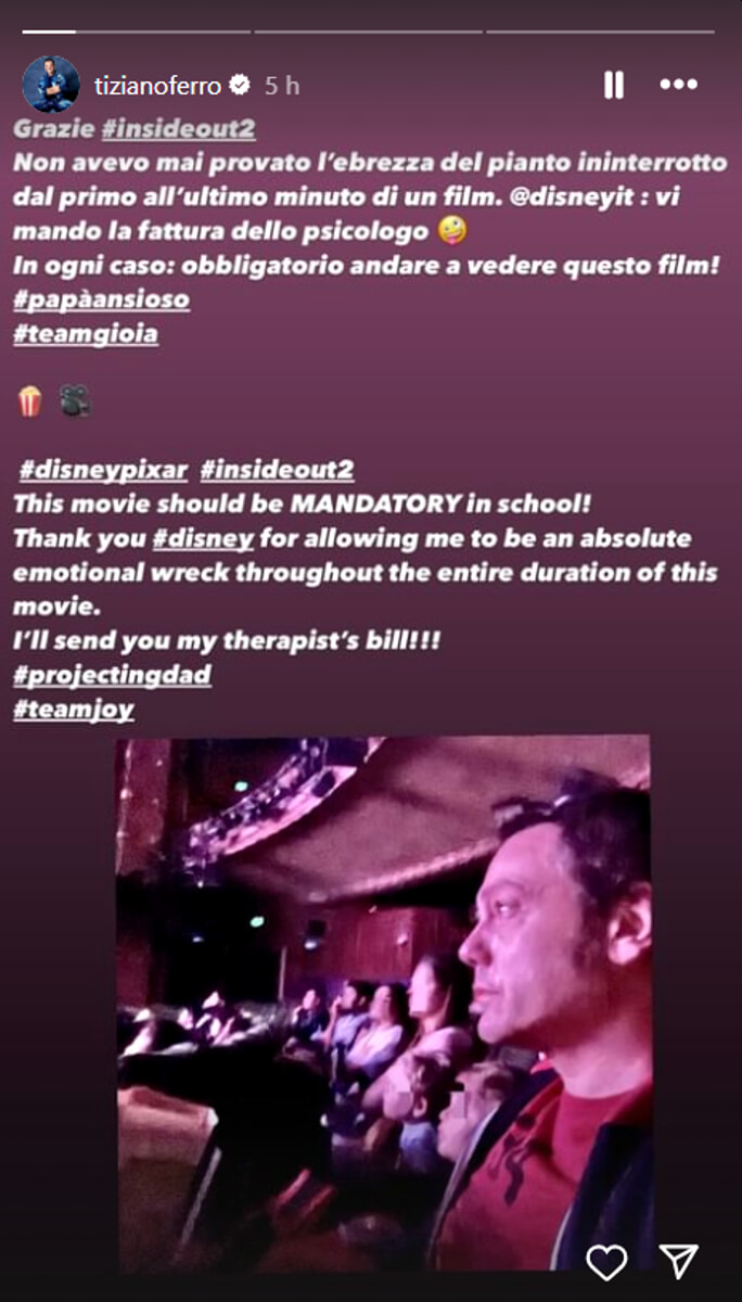 Nelle sue stories, Tiziano ha espresso la sua gratitudine per il film, scrivendo: “Grazie Inside out 2. Non avevo mai provato l’ebrezza del pianto ininterrotto dal primo all’ultimo minuto di un film. Disney: vi mando la fattura dello psicologo. In ogni caso, è obbligatorio andare a vedere questo film”. Gli hashtag utilizzati, “#Papàansioso #TeamGioia”, sottolineano l’intensità emotiva provata dal cantante durante la visione.
