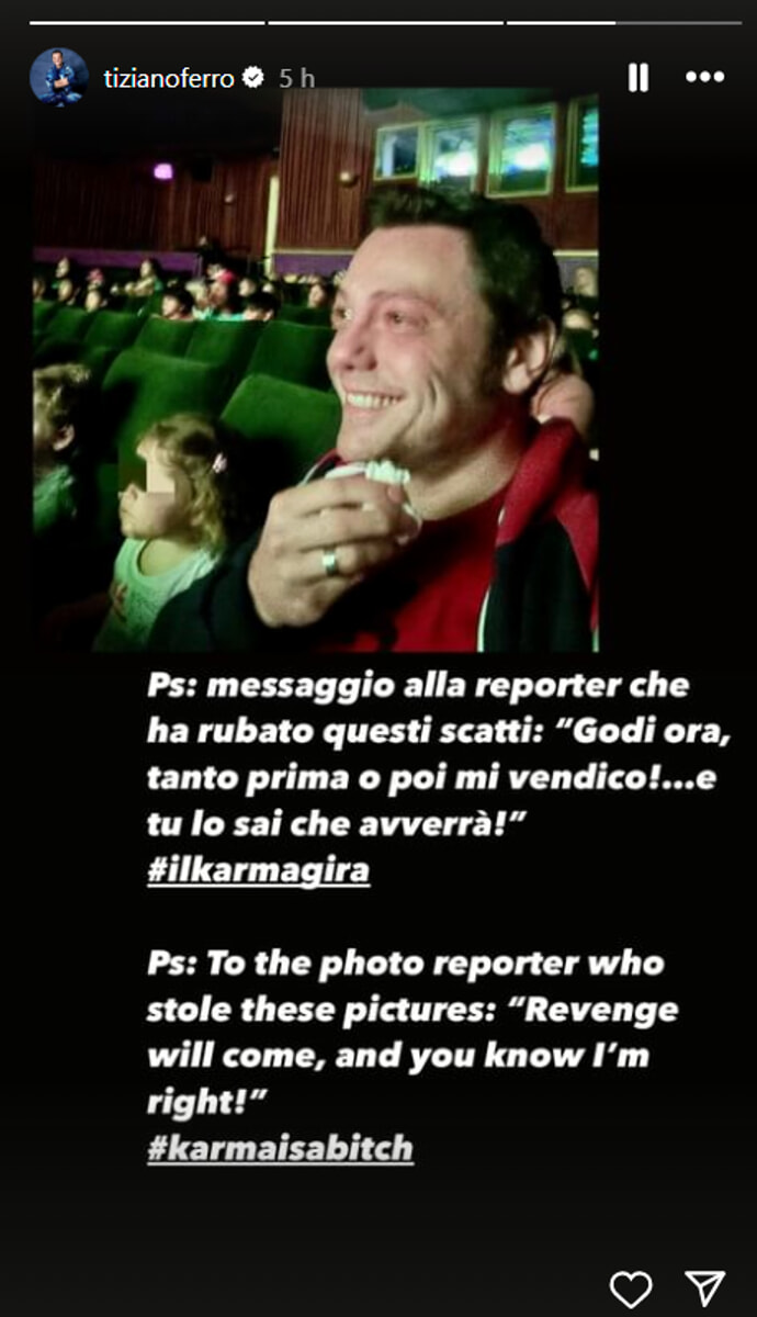 Dopo aver condiviso i teneri momenti trascorsi con i figli, Tiziano Ferro ha pubblicato un messaggio minatorio rivolto a una presunta giornalista che avrebbe rubato alcuni scatti durante la proiezione. Nelle sue parole, il cantante ha minacciato vendetta, affermando che prima o poi il “karma” si sarebbe manifestato. Sebbene non siano chiari i dettagli della vicenda, è probabile che la giornalista abbia scattato alcune foto in un momento così intimo per Tiziano Ferro e la sua famiglia.”Inside Out 2″ si è rivelato un film profondamente toccante per Tiziano Ferro, che ha vissuto un periodo di fragilità emotiva negli ultimi mesi, a seguito della fine del suo matrimonio con il produttore americano Victor Allen e di una pausa dalla sua carriera professionale.
