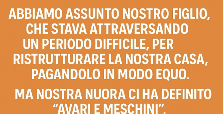 Abbiamo deciso di assumere nostro figlio, che stava attraversando un momento difficile, per ristrutturare la nostra casa. Lo abbiamo pagato in modo equo, anzi, anche più del dovuto. Ma nostra nuora ci ha aggrediti verbalmente, definendoci “tirchi e meschini”.