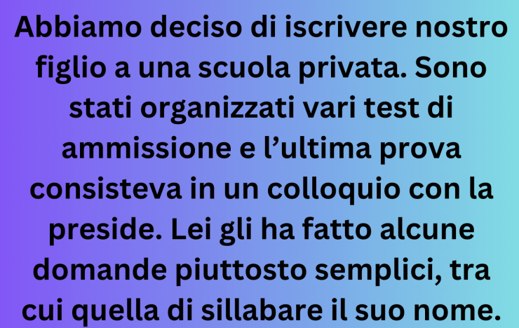 Avevamo deciso di iscrivere nostro figlio a una scuola privata. Dopo una serie di test d’ingresso, l’ultima prova era un colloquio con la preside. Lei gli fece alcune domande piuttosto semplici, tra cui quella di scrivere il suo nome. Lui la guardò perplesso, si alzò e fece per andarsene.