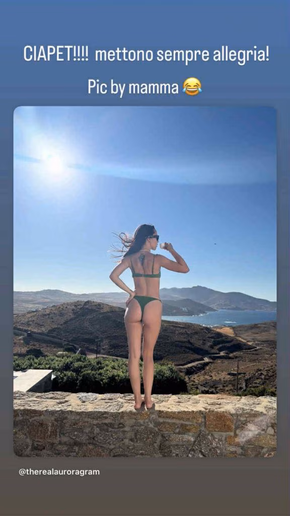 Conosciuta per la sua personalità ironica e anticonvenzionale, Aurora Ramazzotti non ha perso l’occasione di dimostrare il suo spirito scherzoso anche durante questa pausa estiva. Un post pubblicato sui social ha catturato l’attenzione dei fan, mostrando la giovane in un bikini verde bosco mentre posa di spalle, con il mare cristallino e le spiagge paradisiache greche a fare da sfondo.