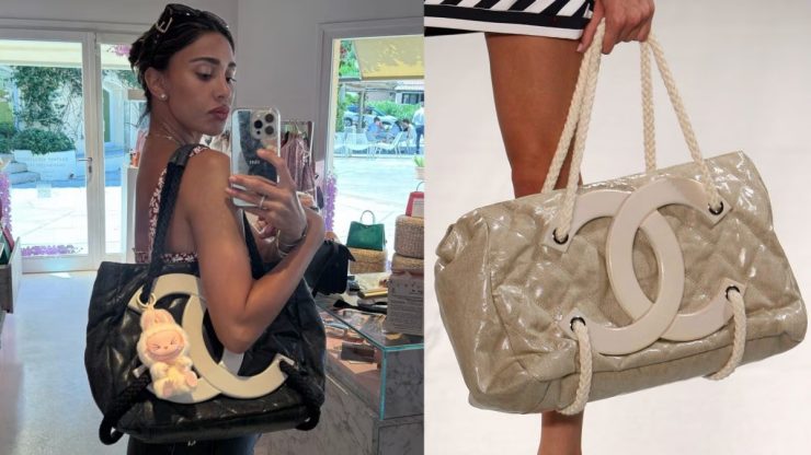 La borsa scelta da Belén Rodriguez è un modello vintage, lanciato dalla Maison francese nel 2008. Si tratta di una maxi bag per la spiaggia, realizzata in tela spalmata con effetto pelle e caratterizzata da impunture matelassé in nero totale. L’accessorio presenta manici in corda e un logo tridimensionale bianco a contrasto con la doppia C di Chanel. Un dettaglio che rende questa borsa particolarmente esclusiva è il fatto che non sia più disponibile sul mercato, se non tramite rivenditori specializzati in articoli vintage e second hand.