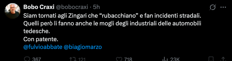Il signor Craxi ha affermato: “Siamo tornati agli Zingari che ‘rubacchiano’ e fanno incidenti stradali. Quelli però li fanno anche le mogli degli industriali delle automobili tedesche. Con patente”.