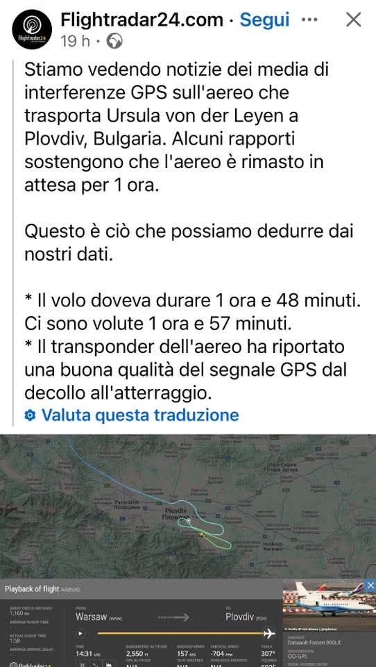 Sul tema è intervenuto anche l’ex deputato Pino Cabras, che sui social ha parlato di “vere interferenze” legate al dibattito politico interno all’Ue. “Flightradar smentisce di fatto la notizia che oggi campeggiava a tutta pagina su Repubblica e Corriere: contrariamente a quanto strillano gli organi dell’atlantismo, l’aereo di Ursula von der Leyen ha ricevuto un buon segnale GPS ‘dal decollo all’atterraggio’”.