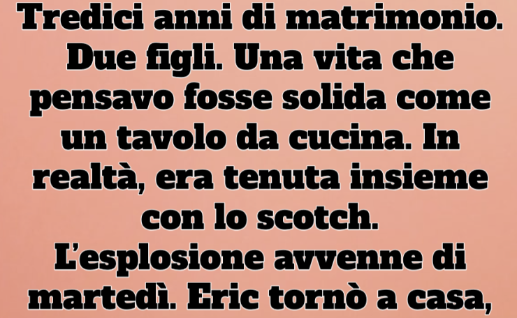 Tredici anni di matrimonio. Due figli. Una vita che pensavo fosse solida come un tavolo da cucina. In realtà, era tenuta insieme con lo scotch.