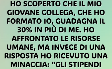 Ho scoperto che il mio giovane collega, che avevo formato io, guadagna il 30% in più di me. Ho affrontato le Risorse Umane, ma invece di una risposta ho ricevuto una minaccia: “Gli stipendi sono confidenziali, divulgare queste informazioni significa il licenziamento!” Ho sorriso. Il giorno dopo, tutti sono rimasti di ghiaccio quando ho rivelato che…