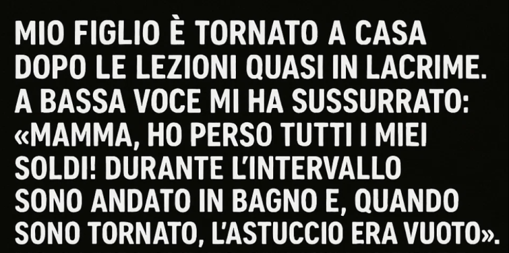 Sottovoce mi sussurrò: «Mamma, ho perso tutti i miei soldi! Durante l’intervallo sono andato in bagno e, quando sono tornato, il mio astuccio era vuoto».