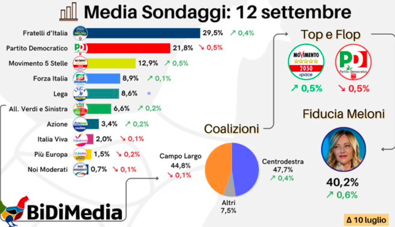 Sul piano nazionale, la forbice resta ampia ma in evoluzione. Secondo l’ultima rilevazione Bidimedia (10 settembre), il M5S è al 13% e Avs al 6,9%. Youtrend per Skytg24 stima Avs al 7,5% e M5S al 13,5%; Swg per La7 assegna il 6,8% ad Avs e il 13,6% ai Cinquestelle; Tecné per Dire accredita Avs al 6,5% e M5S al 12,4%.