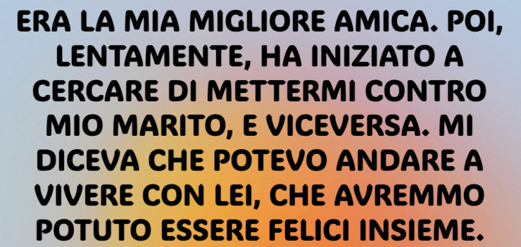Era la mia migliore amica. Poi, lentamente, ha iniziato a mettermi contro mio marito. Mi diceva che potevo andare a vivere da lei, che insieme saremmo state felici.