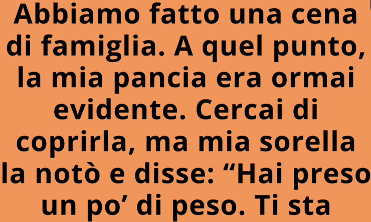 Avevamo organizzato una cena di famiglia. A quel punto, la mia pancia era diventata evidente. Cercai di nasconderla, ma mia sorella la notò e disse: “Hai preso un po’ di peso. Ti dona!”. Ero esausta di dover mentire, così sbottai: “No, sono incinta.”