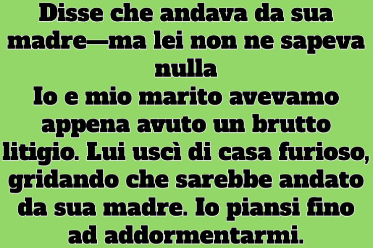 Io e mio marito avevamo appena avuto un brutto litigio. Lui uscì di casa furioso, gridando che sarebbe andato da sua madre. Io piansi fino ad addormentarmi.