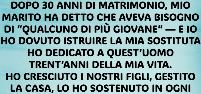 Per trent’anni ero stata la colla che teneva insieme la famiglia: cucinavo, pulivo, organizzavo, sacrificavo senza mai lamentarmi. E per cosa? Perché lui potesse decidere che non ero più abbastanza?