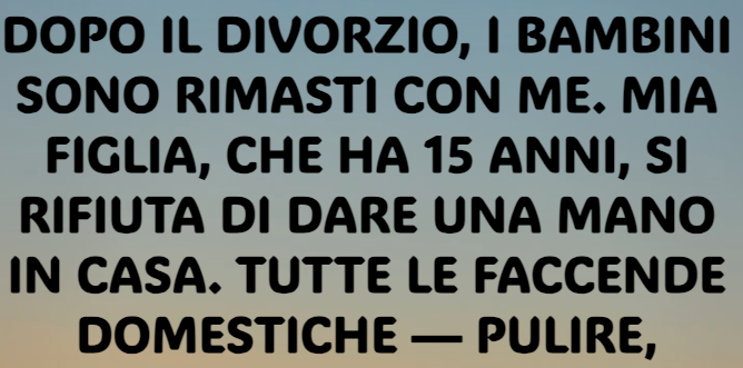 Dopo il divorzio, i bambini sono rimasti con me. Mia figlia, che ha quindici anni, si rifiuta di aiutare in casa. Pulire, cucinare e prendermi cura del suo fratellino sono compiti che ricadono completamente su di me, oltre al duro lavoro di tenere tutto in piedi.