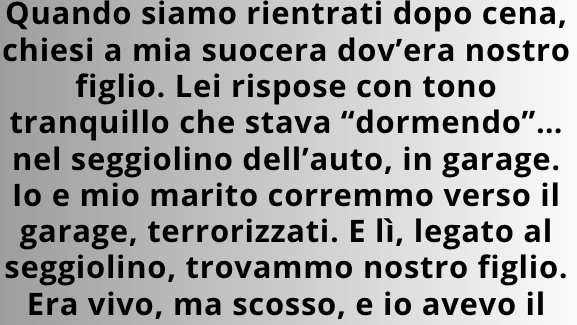 Quando siamo rientrati dopo cena, chiesi a mia suocera dove fosse nostro figlio. Lei rispose, con tono sereno, che stava “dormendo” nel seggiolino dell’auto… in garage.