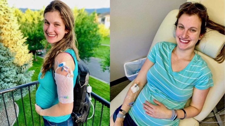 Alla 21a settimana, ho un catetere venoso centrale, l’unico modo in cui il mio corpo riceve liquidi e nutrienti. Sono in nutrizione parenterale totale (NPT) continua tramite una pompa che indosso sulla schiena. Ho un team di infermieri che vengono a casa mia, così posso stare con i miei figli il più a lungo possibile.