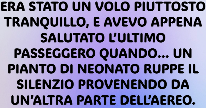 Era stato un volo piuttosto tranquillo, e avevo appena salutato l’ultimo passeggero quando… un pianto di neonato ruppe il silenzio provenendo da un’altra parte dell’aereo. All’inizio pensai che fosse solo la mia immaginazione, la stanchezza che giocava brutti scherzi. Ma poi quel pianto si fece più forte.