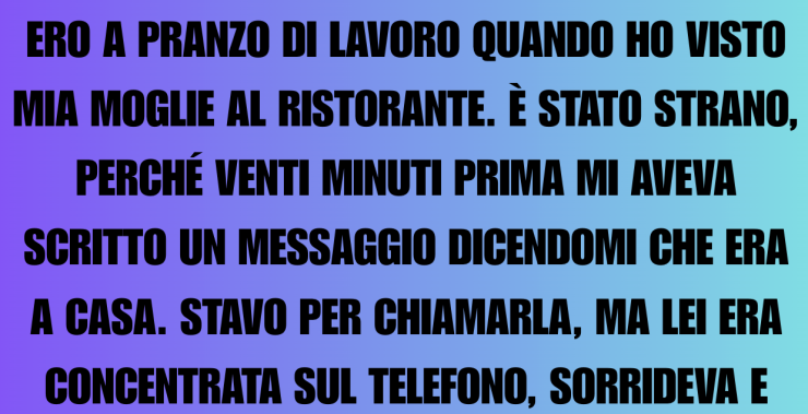 Ero a pranzo con i colleghi quando ho visto mia moglie seduta a un tavolo poco distante. È stato assurdo, perché solo venti minuti prima mi aveva scritto un messaggio per dirmi che era a casa. Stavo per chiamarla, ma lei fissava lo schermo del telefono, sorrideva e stava digitando. All’improvviso, il mio cellulare ha vibrato: era un messaggio da lei. Sono rimasto gelato.