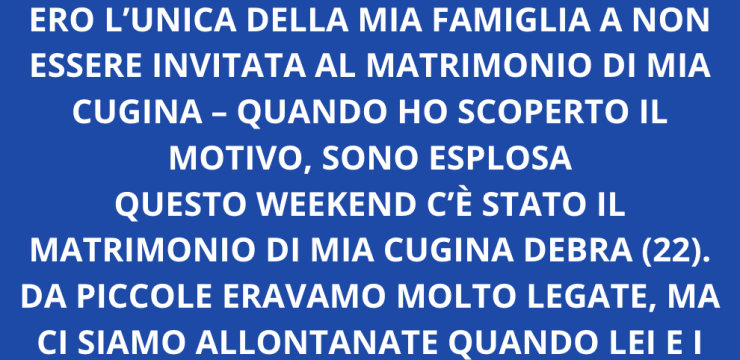 Questo weekend c’è stato il matrimonio di mia cugina Debra (22). Da piccole eravamo molto legate, ma ci siamo allontanate quando lei e i miei fratelli sono andati al college. Un anno e mezzo fa ha iniziato a frequentare Brian, e da allora è stata distante con me—non con i miei fratelli, con cui restava affettuosa. Pensavo fosse solo una questione di differenza d’età.
