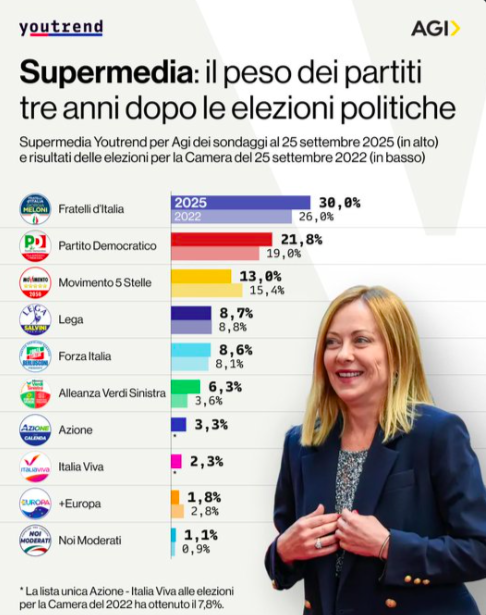 A tre anni dalla loro vittoria alle elezioni politiche, Giorgia Meloni e il suo partito, Fratelli d’Italia, continuano a guadagnare consensi, attestandosi al 30% nelle intenzioni di voto. Questo rappresenta un incremento significativo rispetto al 26% ottenuto nel 2022, consolidando la posizione del partito come principale forza politica in Italia.