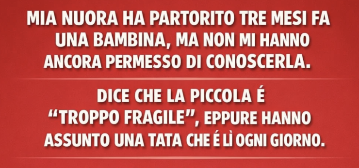 Mia nuora ha partorito tre mesi fa una bambina, ma non mi hanno ancora permesso di conoscerla. Dice che la piccola è «troppo fragile», eppure hanno assunto una tata che è lì ogni giorno. Ne avevo abbastanza, così mi sono presentata senza preavviso. Mi si è gelato il sangue quando ho visto mia nipote.