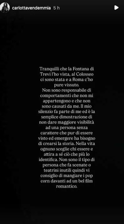In una storia su Instagram, Carlotta ha dichiarato: “Non sono responsabile di comportamenti che non mi appartengono e che non sono causati da me. Il mio silenzio fa parte di me ed è la semplice dimostrazione di non dare maggiore visibilità ad una persona senza carattere che pur di essere visto ed emergere ha bisogno di crearsi la storia.” Con queste parole, ha voluto sottolineare che non intende essere coinvolta in situazioni che non riflettono la sua personalità.