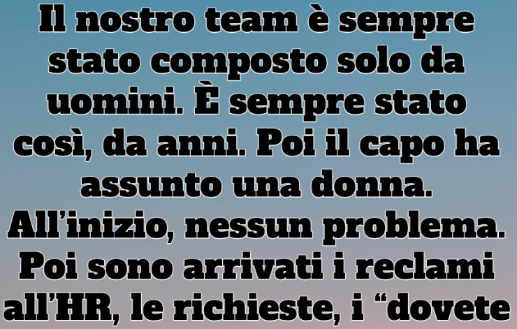 Il nostro team è sempre stato composto solo da uomini. È sempre stato così, da anni. Poi il capo ha assunto una donna. All’inizio, nessun problema. Poi sono arrivati i reclami all’HR, le richieste, i “dovete migliorare”, l’atteggiamento. Stufi, l’abbiamo esclusa. Lei ha dato le dimissioni. E il giorno dopo, con nostro grande stupore, è arrivata un’e-mail da Risorse Umane: