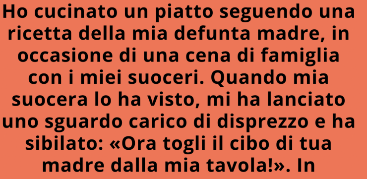 Avevo cucinato un piatto seguendo una ricetta della mia defunta madre per una cena di famiglia con i miei suoceri. Era la prima volta che contribuivo con un piatto: fino a quel momento avevo solo osservato, ai margini. Quando mia suocera lo vide, mi lanciò uno sguardo carico di disprezzo e sussurrò: «Ora togli il cibo di tua madre dalla mia tavola!». In lacrime, corsi in macchina e vi rimasi per un’ora.