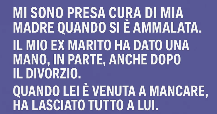 Mi sono presa cura di mia madre quando si è ammalata. Dopo il divorzio, il mio ex marito ha dato una mano, ogni tanto. Quando lei è morta, ha lasciato tutto a lui. E qualcosa, dentro di me, si è spezzato. Così ho parlato con lui, e ha liquidato tutto dicendo che era stata “sopraffatta dalle carte”. Ma poi ho scoperto che l’avvocato… era un suo vecchio compagno di università. Non un esperto di successioni. Non qualcuno che mia madre aveva mai conosciuto prima della diagnosi.
