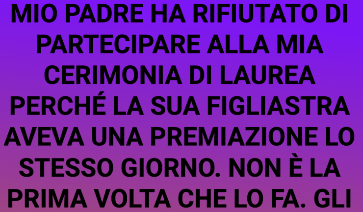 Mio padre ha rifiutato di partecipare alla mia cerimonia di laurea perché la sua figliastra aveva una premiazione lo stesso giorno. Non era la prima volta che lo faceva. Gli ho detto di dimenticare di far parte della mia vita, d’ora in poi. Più tardi, sua moglie mi ha detto che stavo esagerando.