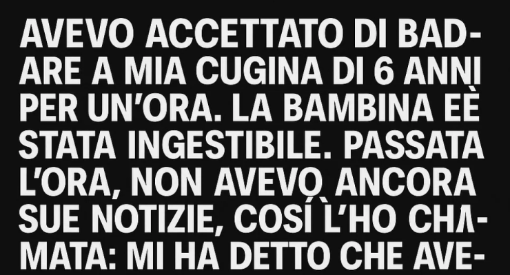 Ero furibondo. Ma non potevo semplicemente abbandonare la bambina. Così l’ho allacciata al seggiolino, ho mandato a mia cugina un messaggio secco: “Te la sto riportando”, e ho guidato per quaranta minuti fino a casa sua.