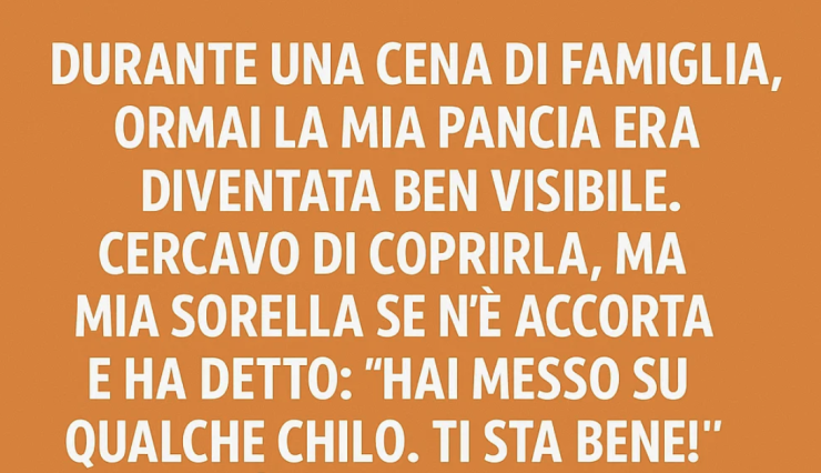 Abbiamo fatto una cena di famiglia. A quel punto la mia pancia era già ben visibile. Cercavo di coprirla, ma mia sorella se ne accorse e disse: “Hai messo su qualche chilo. Ti sta bene!”. Ero così stanca di mentire che mi è scappato: “No, sono solo incinta.”