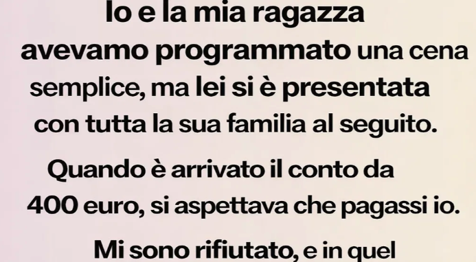 Quando le ho detto che non avrei coperto il conto per tutti, il suo sguardo è cambiato all’istante: prima sorpresa, poi rabbia.