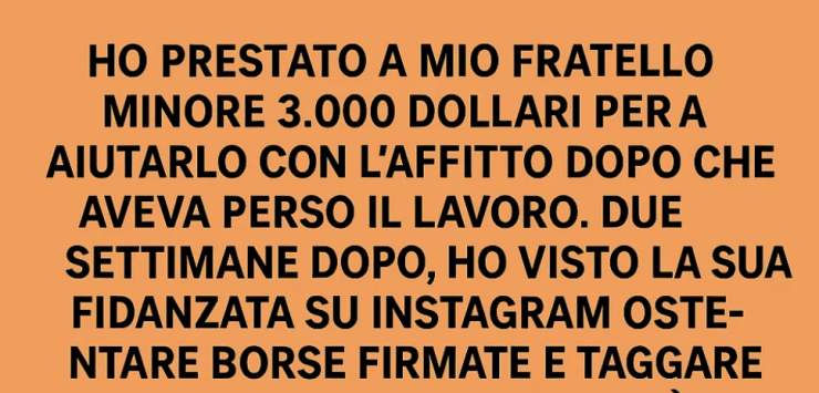 Avevo prestato a mio fratello minore 3.000 dollari per aiutarlo con l’affitto, dopo che aveva perso il lavoro. Due settimane dopo, ho visto su Instagram la sua fidanzata sfoggiare borse firmate e cenare in ristoranti di lusso. Mi si è stretto il petto. L’ho affrontato, e lui ha riso: “Sei famiglia, non una banca.”