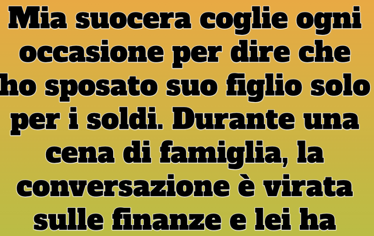 Mia suocera coglie ogni occasione per dire che ho sposato suo figlio solo per i soldi. Durante una cena di famiglia, la conversazione è virata sulle finanze e lei ha commentato: “Dev’essere bello avere un uomo che paga per tutto!” Mi sono infuriata nel sentirlo davanti a tutti. Il suo sorriso scomparve quando risposi: “In realtà, guadagno più di tuo figlio. Semplicemente non lo ostento, perché non sento il bisogno di dimostrare nulla. Ma visto che siamo onesti a tavola…”