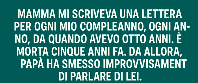 Mia madre mi scriveva lettere per il mio compleanno, ogni anno, da quando avevo otto anni. È morta cinque anni fa. Mio padre ha smesso improvvisamente di parlarne. Quest’anno, nel giorno del mio ventitreesimo compleanno, mia zia mi ha consegnato segretamente una cartolina. L’ho aperta e ho visto la calligrafia di mia madre. Pensavo fosse un altro augurio di compleanno, ma con mia grande sorpresa, all’interno c’era una piccola scheda micro-SD criptata e un pezzo di pergamena rigida contenente un insieme di coordinate geografiche.