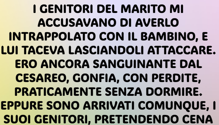 Ero ancora sanguinante dal cesareo, gonfia, con perdite, praticamente senza dormire. Eppure sono arrivati comunque, i suoi genitori, pretendendo cena perché «la tradizione è tradizione».