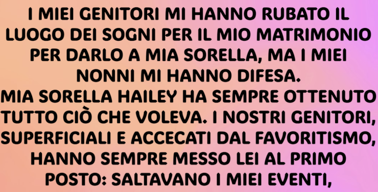 I miei genitori mi hanno rubato il luogo dei sogni per il mio matrimonio per darlo a mia sorella, ma i miei nonni mi hanno difesa