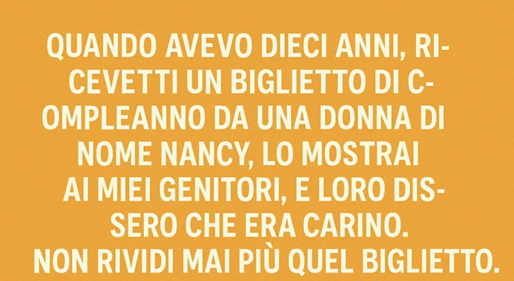 Avevo dieci anni quando ricevetti un biglietto di compleanno da una donna di nome Nancy. Lo mostrai ai miei genitori, e lo trovarono carino. Non lo rividi mai più.