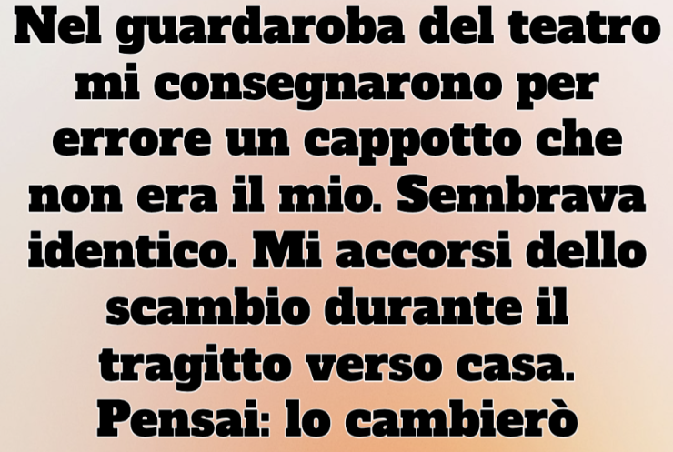 Nel guardaroba del teatro mi consegnarono per errore un cappotto che non era il mio. Sembrava identico. Mi accorsi dello scambio durante il tragitto verso casa. Pensai: lo cambierò domani. Salgo in ascensore con il mio vicino, e lui inizia a fissare il cappotto.