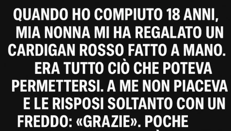 Quando ho compiuto 18 anni, mia nonna mi ha regalato un cardigan rosso che aveva lavorato a maglia per me. Era tutto ciò che poteva permettersi. A me non piaceva e le dissi solo un freddo «Grazie». Poche settimane dopo lei morì. Gli anni passarono e non lo indossai mai.