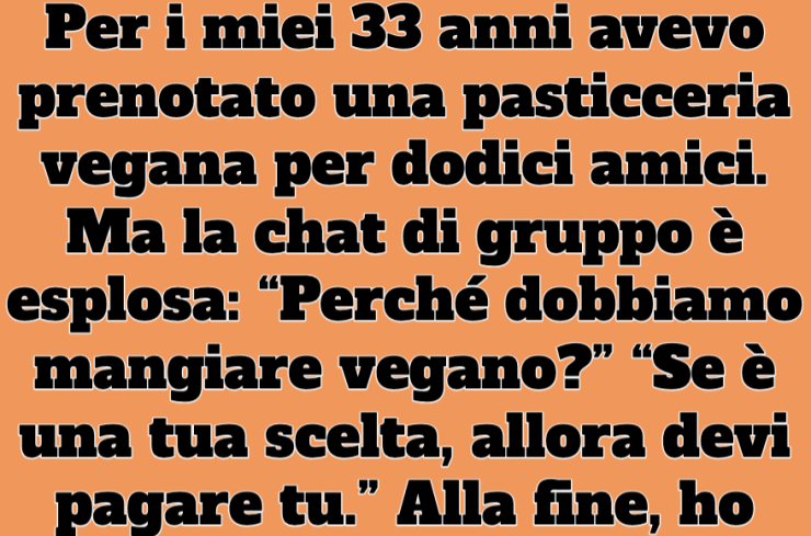 Per i miei 33 anni avevo prenotato una pasticceria vegana per dodici amici. Ma la chat di gruppo è esplosa: “Perché dobbiamo mangiare vegano?” “Se è una tua scelta, allora devi pagare tu.” Alla fine, ho annullato tutto. Il giorno del mio compleanno, ho invitato solo due colleghi sinceri in una steakhouse elegante, e abbiamo finito per parlare per quattro ore di fila.