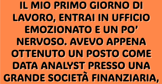 Il mio primo giorno di lavoro, entrai in ufficio emozionato e un po’ nervoso. Avevo appena ottenuto un posto come data analyst presso una grande società finanziaria, la Sterling Capital, con sede in un elegante grattacielo di vetro a Chicago, Illinois. Dopo mesi di preparazione, ero determinato a fare una buona impressione. Arrivai con mezz’ora di anticipo, pronto a cominciare con entusiasmo.