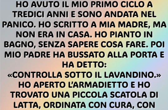 Ho avuto il mio primo ciclo a tredici anni e sono andata nel panico. Ho scritto a mia madre, ma non era in casa. Ho pianto in bagno, senza sapere cosa fare. Poi mio padre ha bussato alla porta e ha detto: