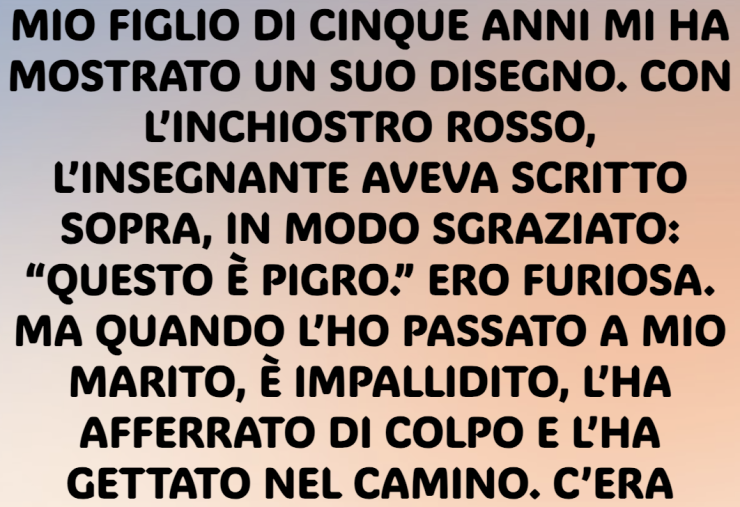 Ero furiosa. Chi scrive una cosa del genere su un disegno di un bambino? Lui sorrideva, felice, completamente ignaro delle parole crudeli che rovinavano il suo lavoro. Mi si è stretto lo stomaco.