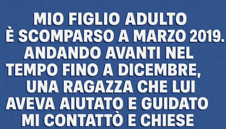 Mio figlio adulto è scomparso a marzo 2019. Andando avanti nel tempo fino a dicembre, una ragazza che lui aveva aiutato e guidato mi contattò e chiese il mio indirizzo. Pensai che forse volesse mandarmi un biglietto di auguri, così glielo diedi. Una settimana dopo mi contattò di nuovo e rivelò di avere qualcosa di suo che desiderava consegnarmi.