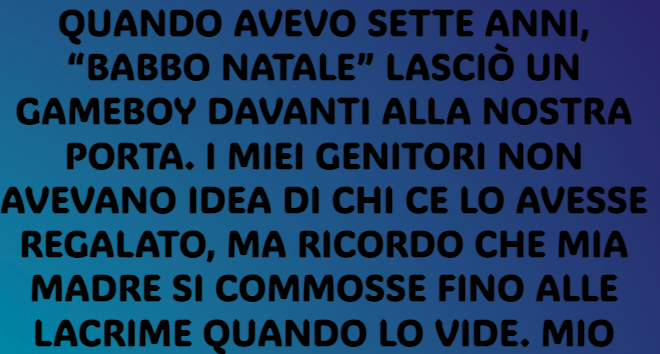 Avevo sette anni quando “Babbo Natale” lasciò un Gameboy davanti alla nostra porta. I miei genitori non avevano idea di chi ce lo avesse regalato, ma ricordo ancora le lacrime negli occhi di mia madre quando lo vide. Mio padre ha sempre sospettato che fosse stato un amico di famiglia. L’anno scorso, però, papà è venuto a mancare. E fu allora che mamma mi raccontò qualcosa che non avrei mai immaginato.